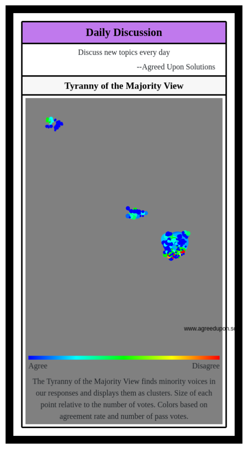 The Tyranny of the Majority View finds minority voices in our responses and displays them as clusters. Size of each point relative to the number of votes. Colors based on agreement rate and number of pass votes.