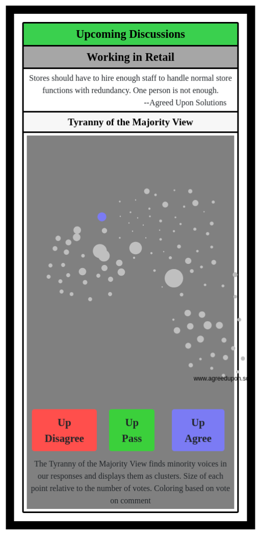 The Tyranny of the Majority View finds minority voices in our responses and displays them as clusters. Size of each point relative to the number of votes. Coloring based on vote on comment