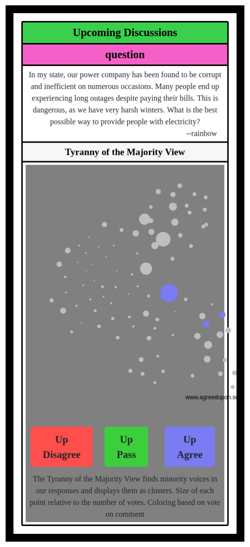 The Tyranny of the Majority View finds minority voices in our responses and displays them as clusters. Size of each point relative to the number of votes. Coloring based on vote on comment