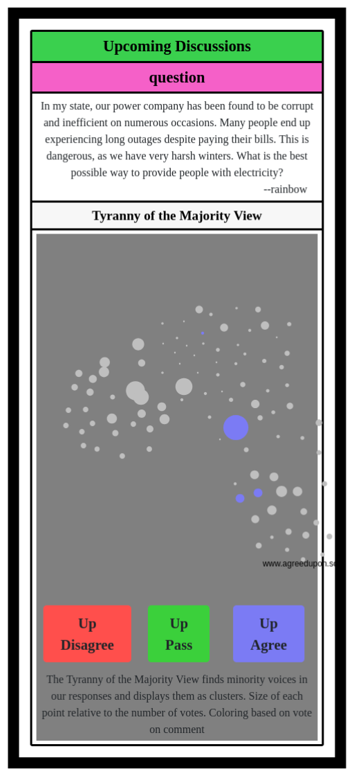 The Tyranny of the Majority View finds minority voices in our responses and displays them as clusters. Size of each point relative to the number of votes. Coloring based on vote on comment