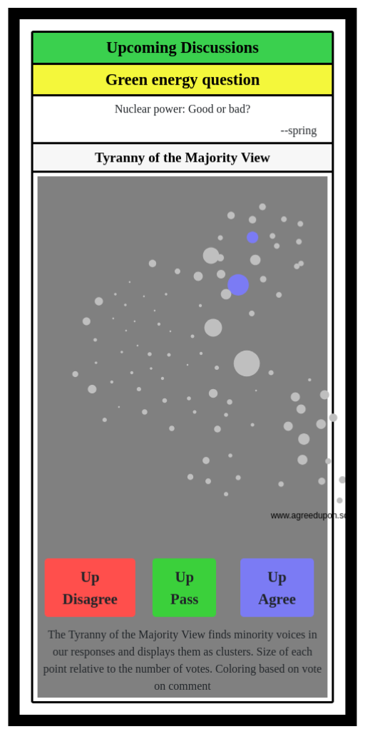 The Tyranny of the Majority View finds minority voices in our responses and displays them as clusters. Size of each point relative to the number of votes. Coloring based on vote on comment