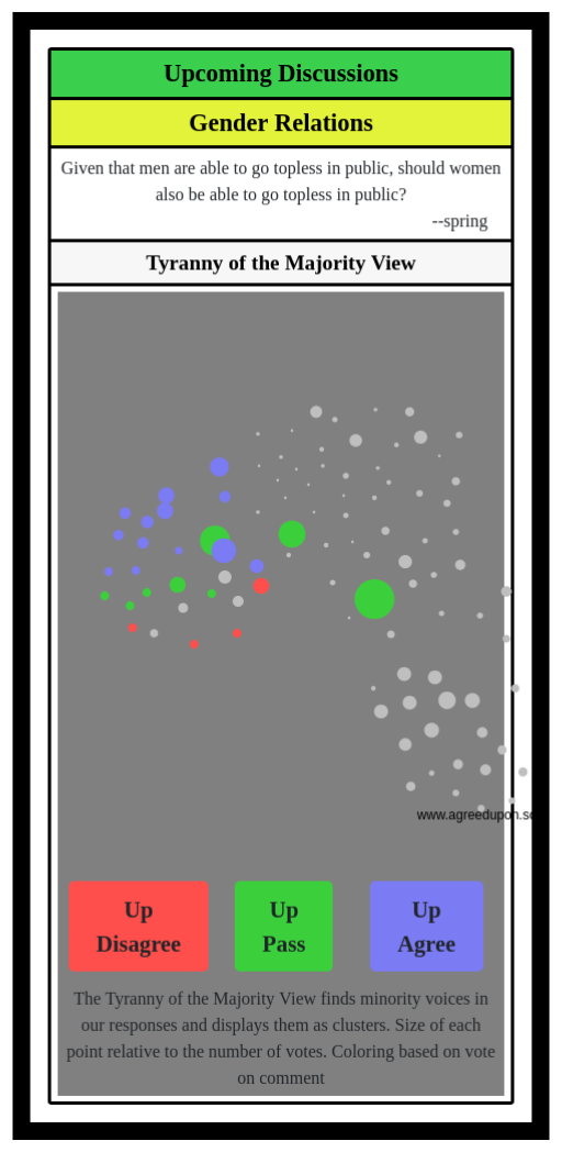 The Tyranny of the Majority View finds minority voices in our responses and displays them as clusters. Size of each point relative to the number of votes. Coloring based on vote on comment