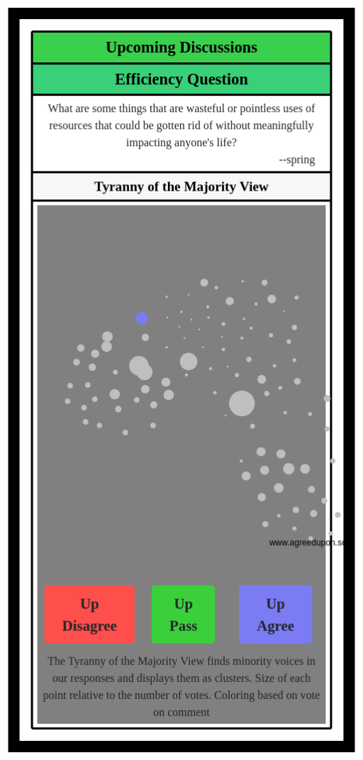 The Tyranny of the Majority View finds minority voices in our responses and displays them as clusters. Size of each point relative to the number of votes. Coloring based on vote on comment