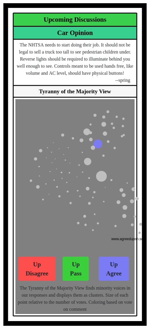 The Tyranny of the Majority View finds minority voices in our responses and displays them as clusters. Size of each point relative to the number of votes. Coloring based on vote on comment