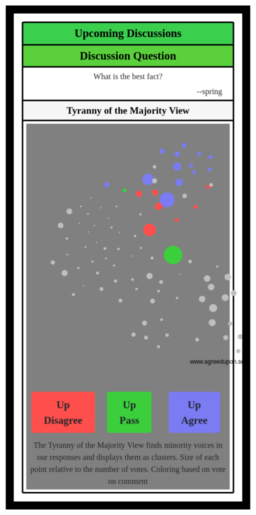 The Tyranny of the Majority View finds minority voices in our responses and displays them as clusters. Size of each point relative to the number of votes. Coloring based on vote on comment