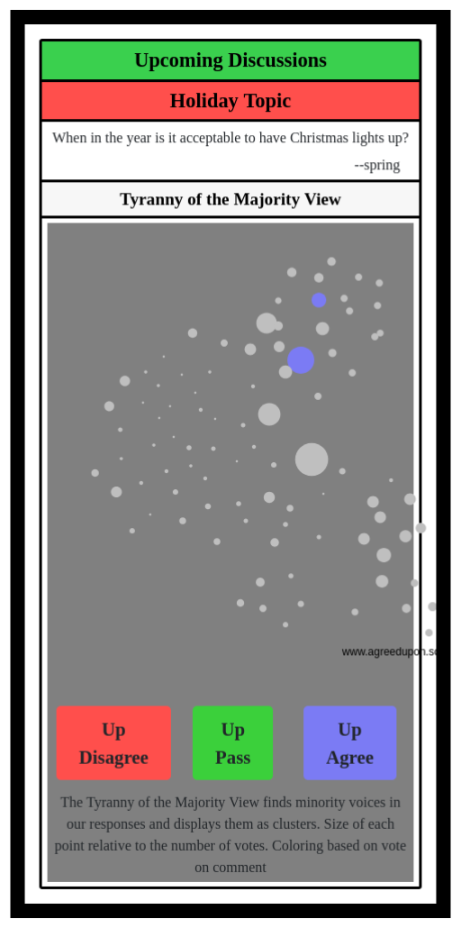 The Tyranny of the Majority View finds minority voices in our responses and displays them as clusters. Size of each point relative to the number of votes. Coloring based on vote on comment