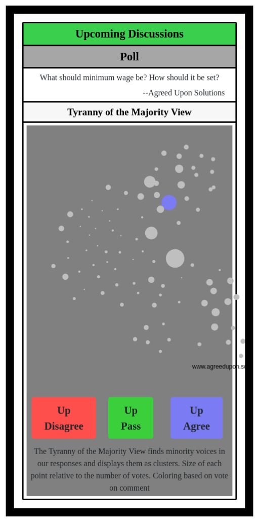 The Tyranny of the Majority View finds minority voices in our responses and displays them as clusters. Size of each point relative to the number of votes. Coloring based on vote on comment