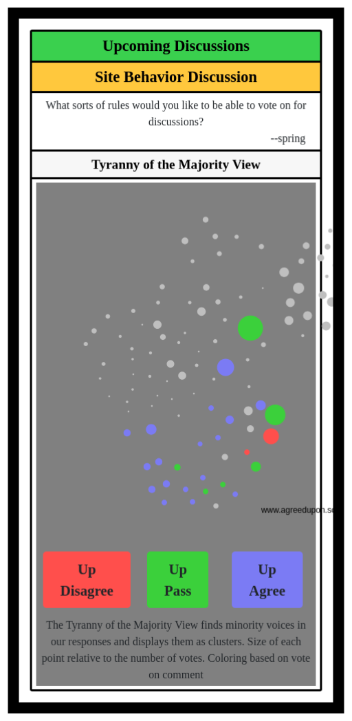 The Tyranny of the Majority View finds minority voices in our responses and displays them as clusters. Size of each point relative to the number of votes. Coloring based on vote on comment