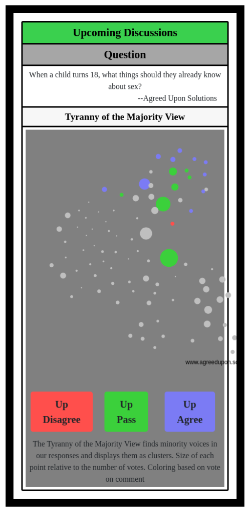 The Tyranny of the Majority View finds minority voices in our responses and displays them as clusters. Size of each point relative to the number of votes. Coloring based on vote on comment