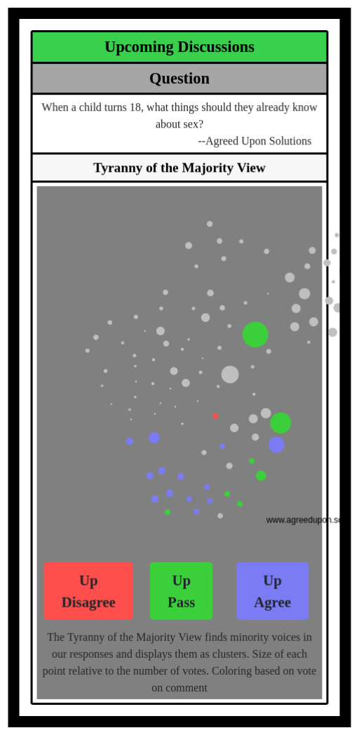 The Tyranny of the Majority View finds minority voices in our responses and displays them as clusters. Size of each point relative to the number of votes. Coloring based on vote on comment
