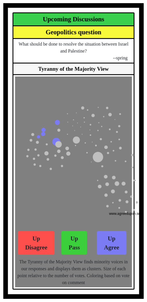 The Tyranny of the Majority View finds minority voices in our responses and displays them as clusters. Size of each point relative to the number of votes. Coloring based on vote on comment