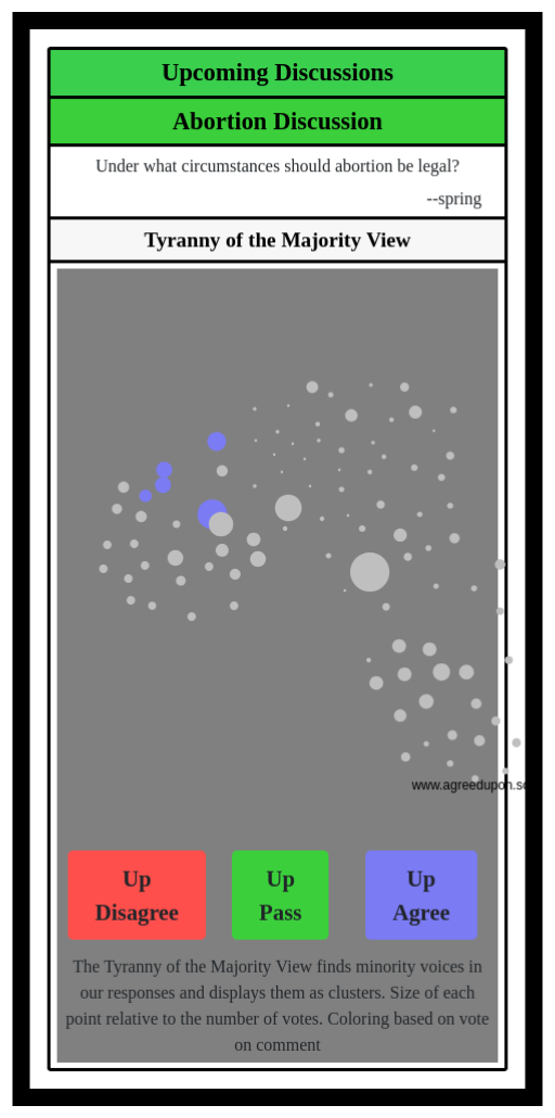 The Tyranny of the Majority View finds minority voices in our responses and displays them as clusters. Size of each point relative to the number of votes. Coloring based on vote on comment