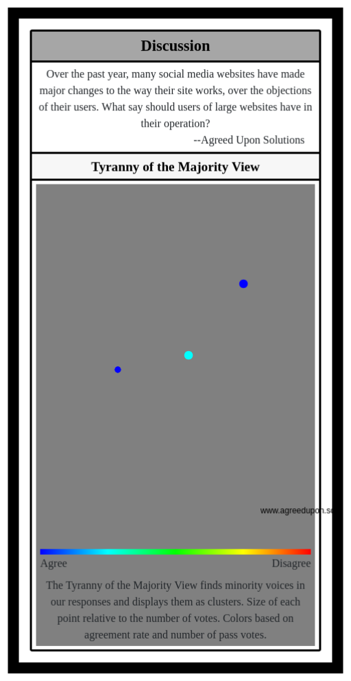 The Tyranny of the Majority View finds minority voices in our responses and displays them as clusters. Size of each point relative to the number of votes. Colors based on agreement rate and number of pass votes.