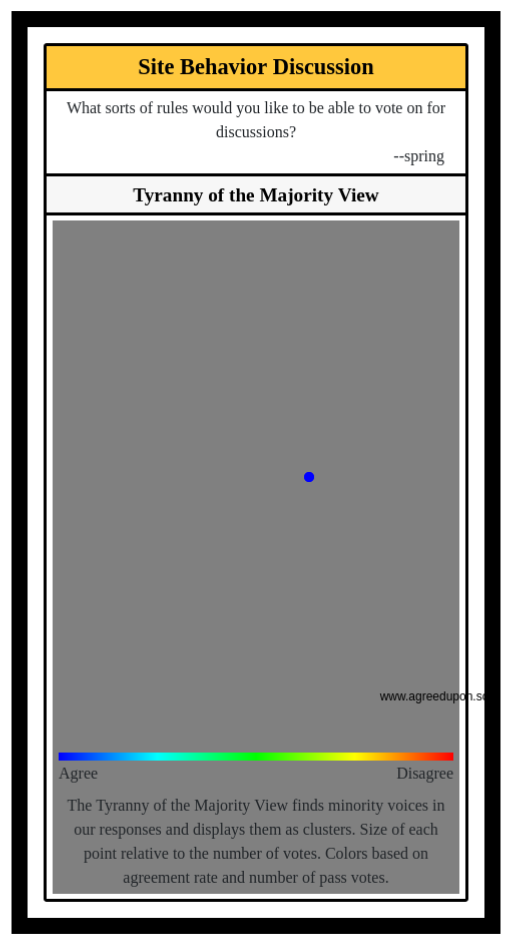 The Tyranny of the Majority View finds minority voices in our responses and displays them as clusters. Size of each point relative to the number of votes. Colors based on agreement rate and number of pass votes.
