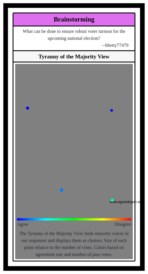 The Tyranny of the Majority View finds minority voices in our responses and displays them as clusters. Size of each point relative to the number of votes. Colors based on agreement rate and number of pass votes.
