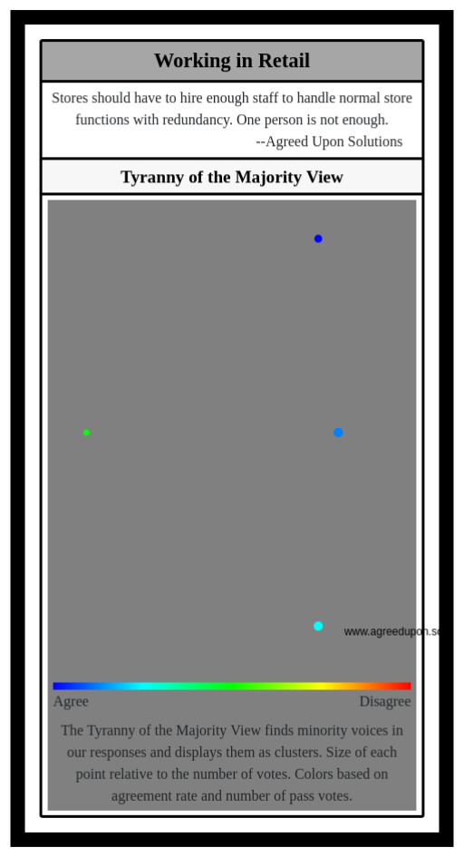 The Tyranny of the Majority View finds minority voices in our responses and displays them as clusters. Size of each point relative to the number of votes. Colors based on agreement rate and number of pass votes.