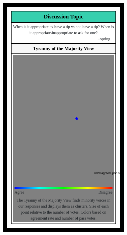 The Tyranny of the Majority View finds minority voices in our responses and displays them as clusters. Size of each point relative to the number of votes. Colors based on agreement rate and number of pass votes.