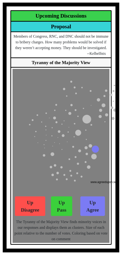 The Tyranny of the Majority View finds minority voices in our responses and displays them as clusters. Size of each point relative to the number of votes. Coloring based on vote on comment