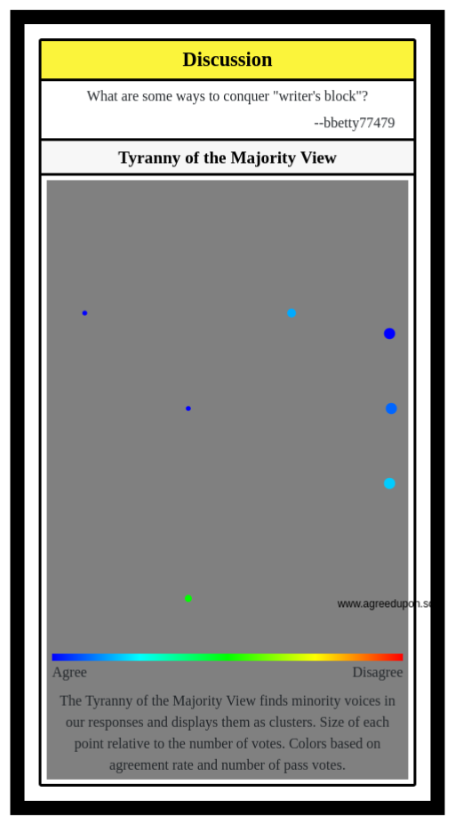 The Tyranny of the Majority View finds minority voices in our responses and displays them as clusters. Size of each point relative to the number of votes. Colors based on agreement rate and number of pass votes.