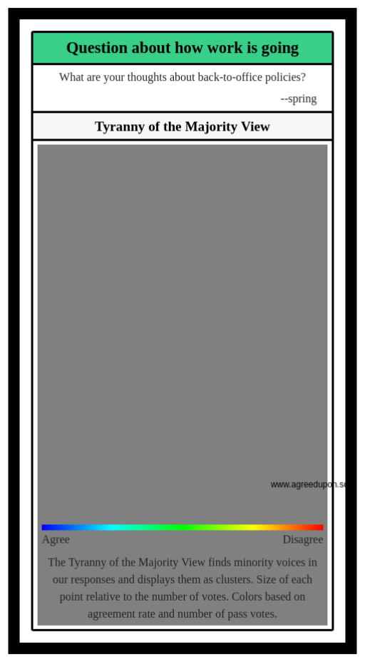 The Tyranny of the Majority View finds minority voices in our responses and displays them as clusters. Size of each point relative to the number of votes. Colors based on agreement rate and number of pass votes.