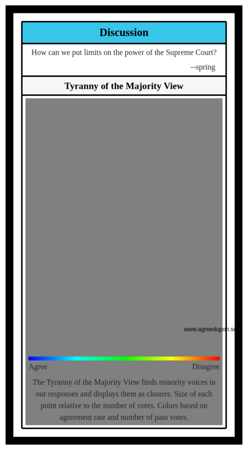 The Tyranny of the Majority View finds minority voices in our responses and displays them as clusters. Size of each point relative to the number of votes. Colors based on agreement rate and number of pass votes.