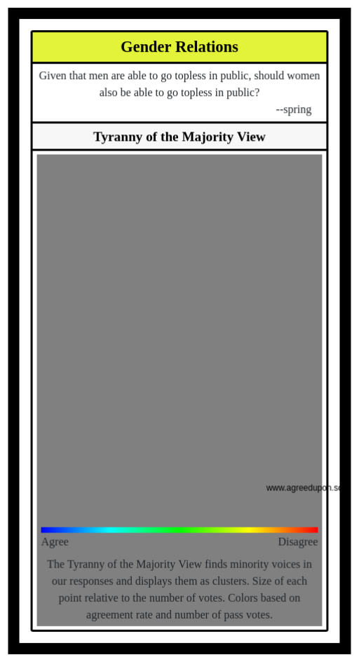 The Tyranny of the Majority View finds minority voices in our responses and displays them as clusters. Size of each point relative to the number of votes. Colors based on agreement rate and number of pass votes.
