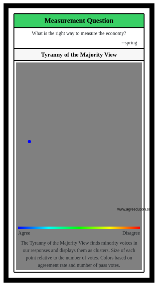 The Tyranny of the Majority View finds minority voices in our responses and displays them as clusters. Size of each point relative to the number of votes. Colors based on agreement rate and number of pass votes.