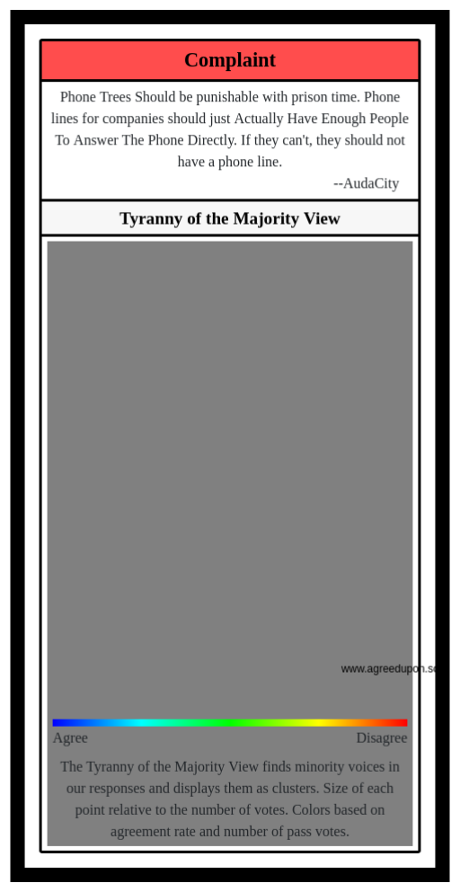 The Tyranny of the Majority View finds minority voices in our responses and displays them as clusters. Size of each point relative to the number of votes. Colors based on agreement rate and number of pass votes.