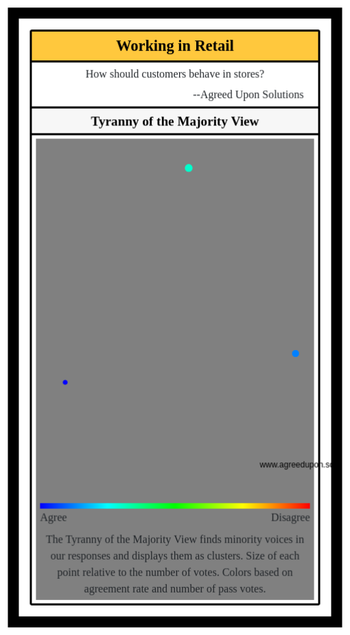 The Tyranny of the Majority View finds minority voices in our responses and displays them as clusters. Size of each point relative to the number of votes. Colors based on agreement rate and number of pass votes.