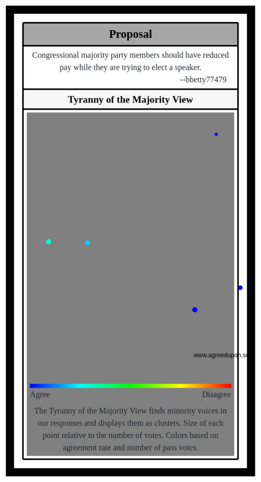 The Tyranny of the Majority View finds minority voices in our responses and displays them as clusters. Size of each point relative to the number of votes. Colors based on agreement rate and number of pass votes.