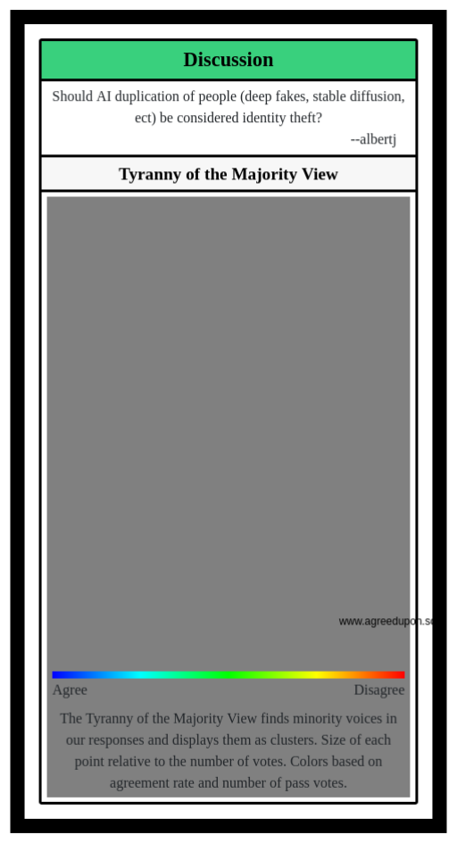 The Tyranny of the Majority View finds minority voices in our responses and displays them as clusters. Size of each point relative to the number of votes. Colors based on agreement rate and number of pass votes.