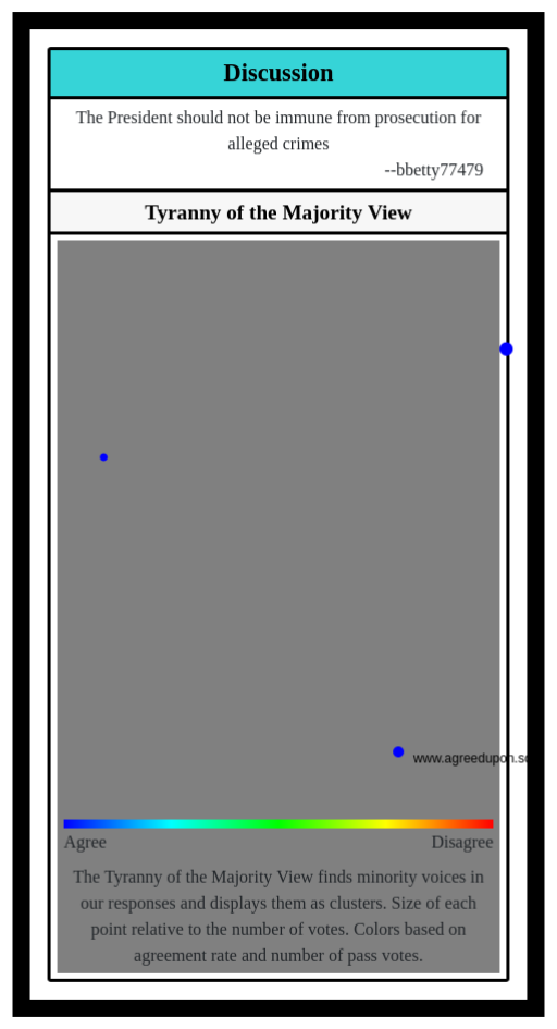 The Tyranny of the Majority View finds minority voices in our responses and displays them as clusters. Size of each point relative to the number of votes. Colors based on agreement rate and number of pass votes.