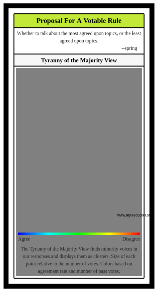The Tyranny of the Majority View finds minority voices in our responses and displays them as clusters. Size of each point relative to the number of votes. Colors based on agreement rate and number of pass votes.
