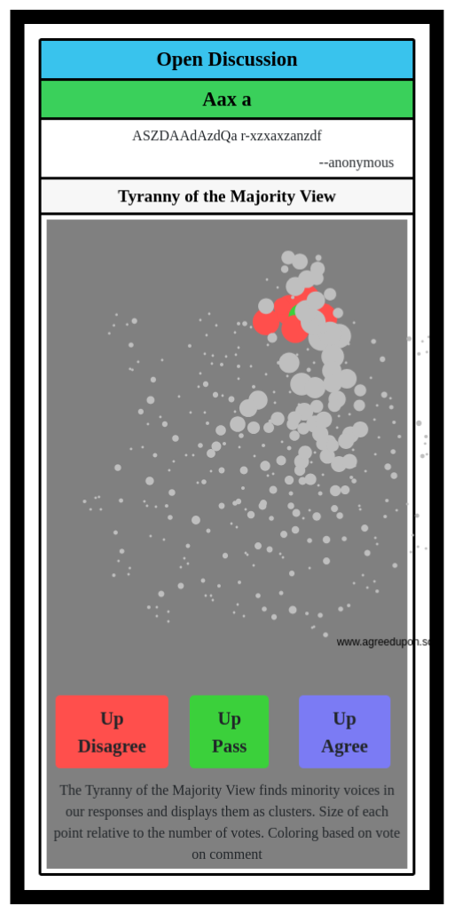 The Tyranny of the Majority View finds minority voices in our responses and displays them as clusters. Size of each point relative to the number of votes. Coloring based on vote on comment
