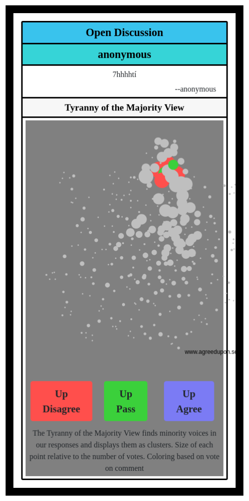 The Tyranny of the Majority View finds minority voices in our responses and displays them as clusters. Size of each point relative to the number of votes. Coloring based on vote on comment