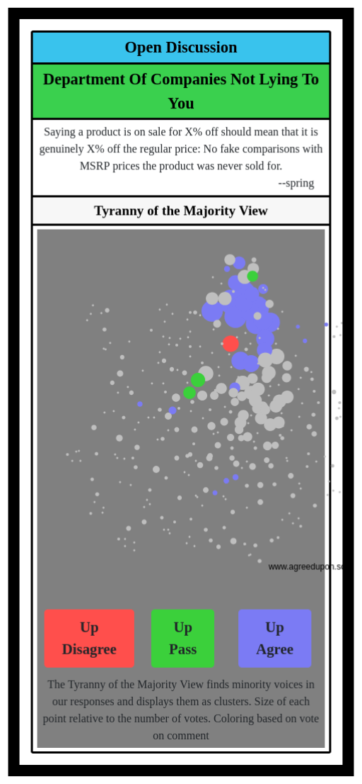 The Tyranny of the Majority View finds minority voices in our responses and displays them as clusters. Size of each point relative to the number of votes. Coloring based on vote on comment