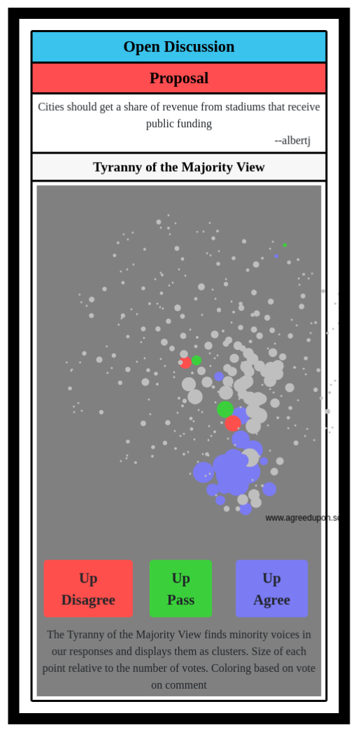 The Tyranny of the Majority View finds minority voices in our responses and displays them as clusters. Size of each point relative to the number of votes. Coloring based on vote on comment