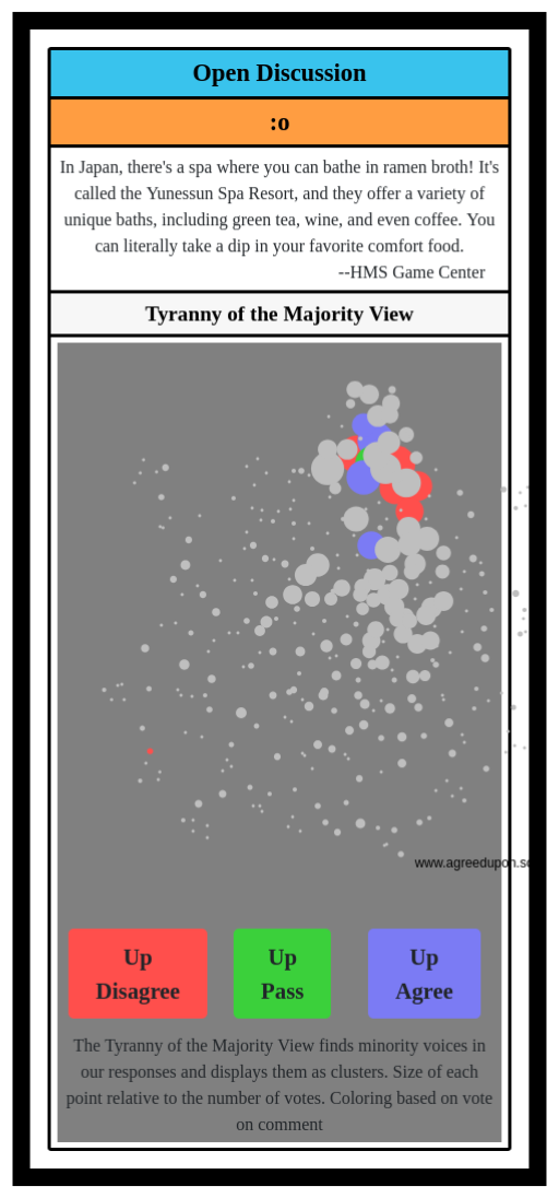 The Tyranny of the Majority View finds minority voices in our responses and displays them as clusters. Size of each point relative to the number of votes. Coloring based on vote on comment