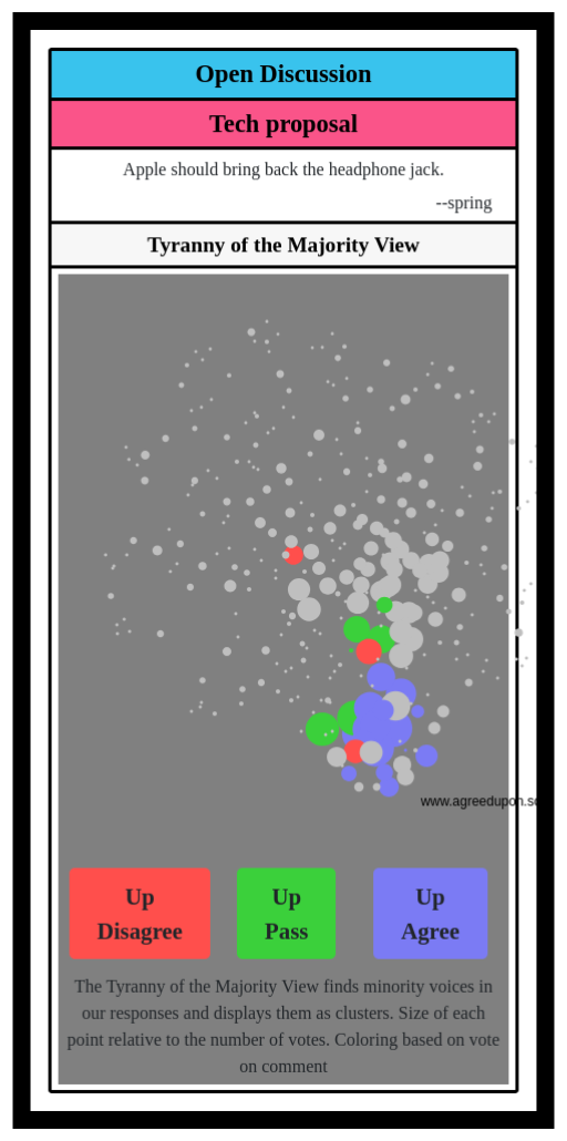 The Tyranny of the Majority View finds minority voices in our responses and displays them as clusters. Size of each point relative to the number of votes. Coloring based on vote on comment