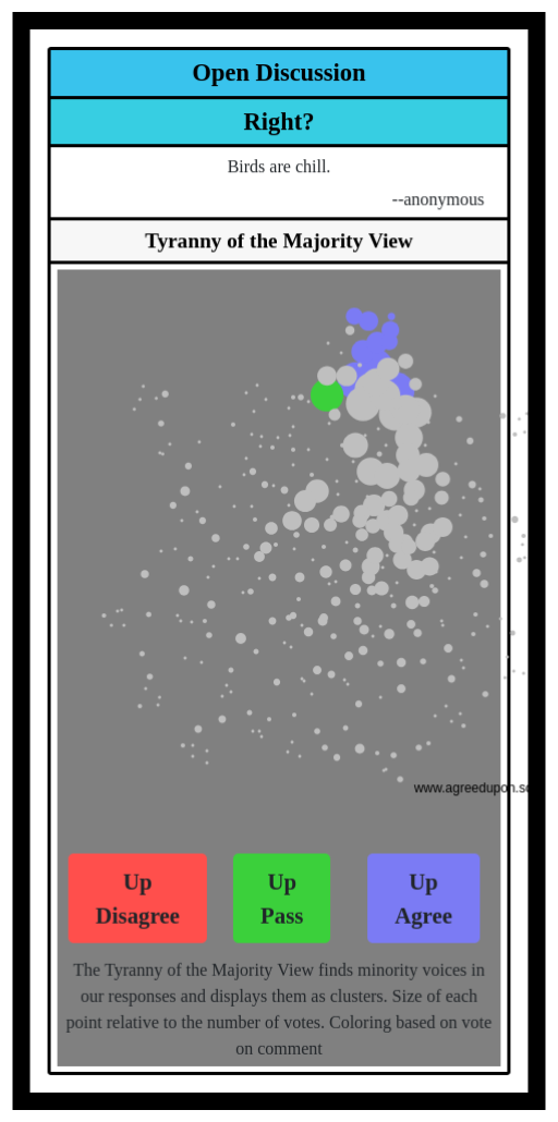 The Tyranny of the Majority View finds minority voices in our responses and displays them as clusters. Size of each point relative to the number of votes. Coloring based on vote on comment