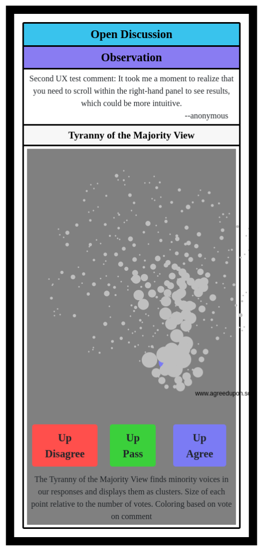 The Tyranny of the Majority View finds minority voices in our responses and displays them as clusters. Size of each point relative to the number of votes. Coloring based on vote on comment