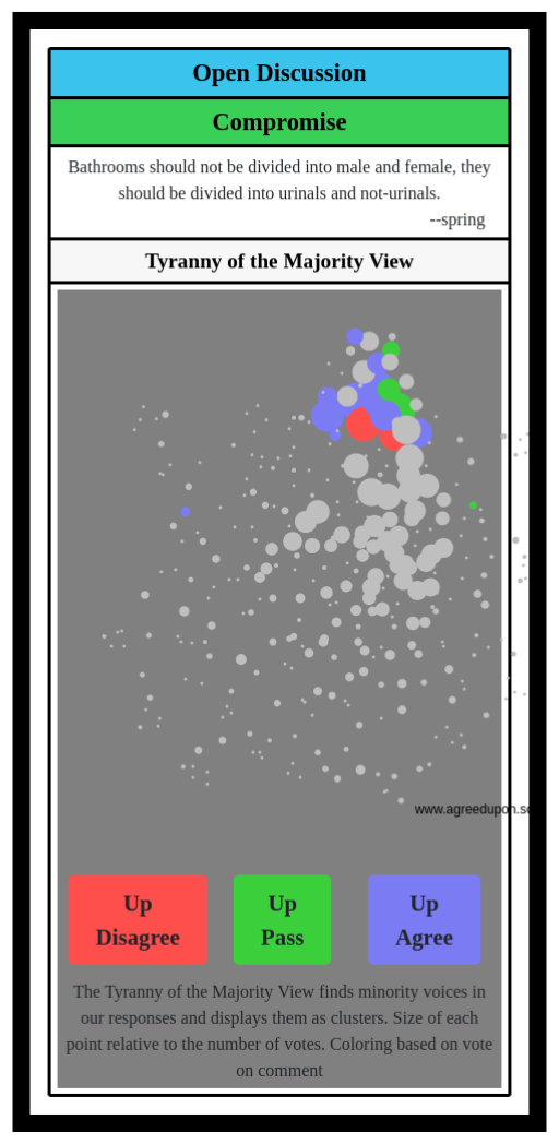 The Tyranny of the Majority View finds minority voices in our responses and displays them as clusters. Size of each point relative to the number of votes. Coloring based on vote on comment