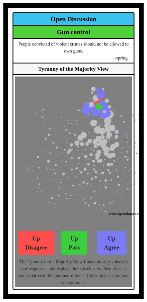 The Tyranny of the Majority View finds minority voices in our responses and displays them as clusters. Size of each point relative to the number of votes. Coloring based on vote on comment