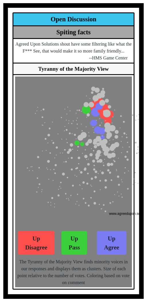 The Tyranny of the Majority View finds minority voices in our responses and displays them as clusters. Size of each point relative to the number of votes. Coloring based on vote on comment