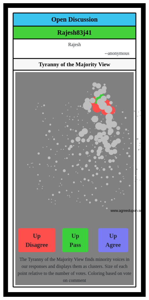 The Tyranny of the Majority View finds minority voices in our responses and displays them as clusters. Size of each point relative to the number of votes. Coloring based on vote on comment