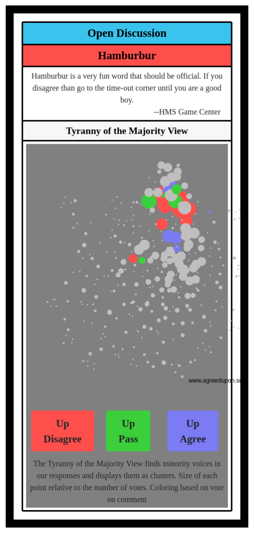 The Tyranny of the Majority View finds minority voices in our responses and displays them as clusters. Size of each point relative to the number of votes. Coloring based on vote on comment