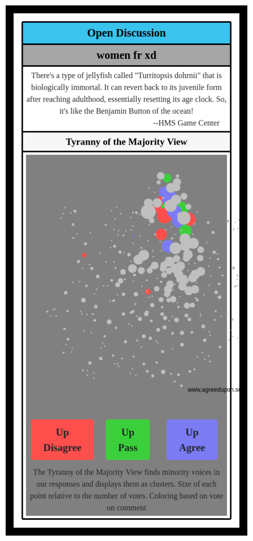 The Tyranny of the Majority View finds minority voices in our responses and displays them as clusters. Size of each point relative to the number of votes. Coloring based on vote on comment