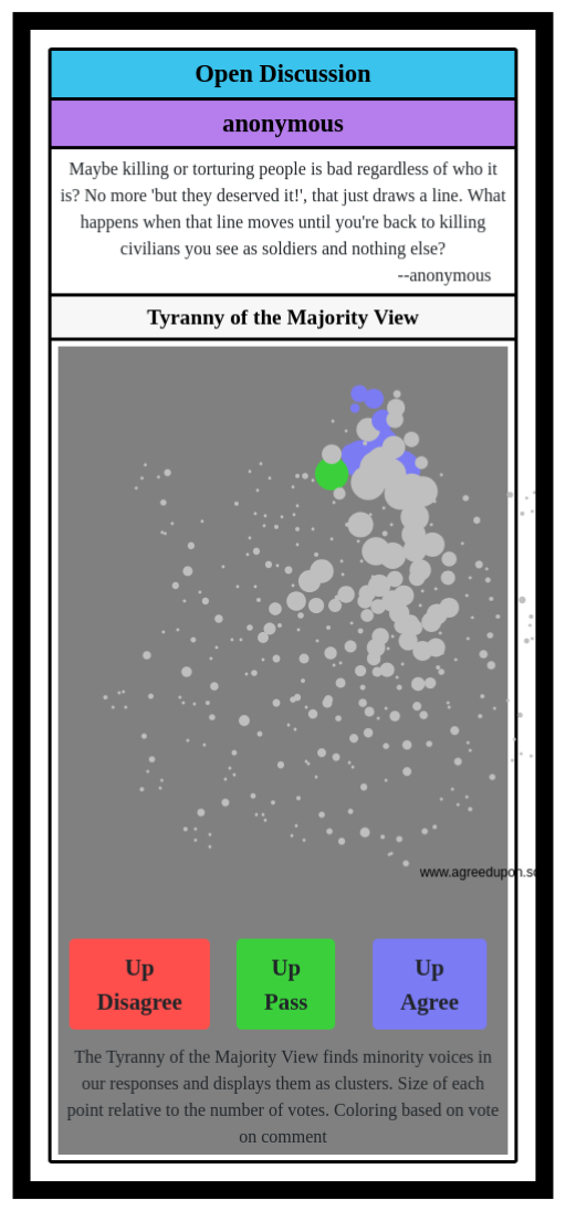 The Tyranny of the Majority View finds minority voices in our responses and displays them as clusters. Size of each point relative to the number of votes. Coloring based on vote on comment