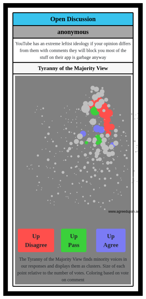 The Tyranny of the Majority View finds minority voices in our responses and displays them as clusters. Size of each point relative to the number of votes. Coloring based on vote on comment