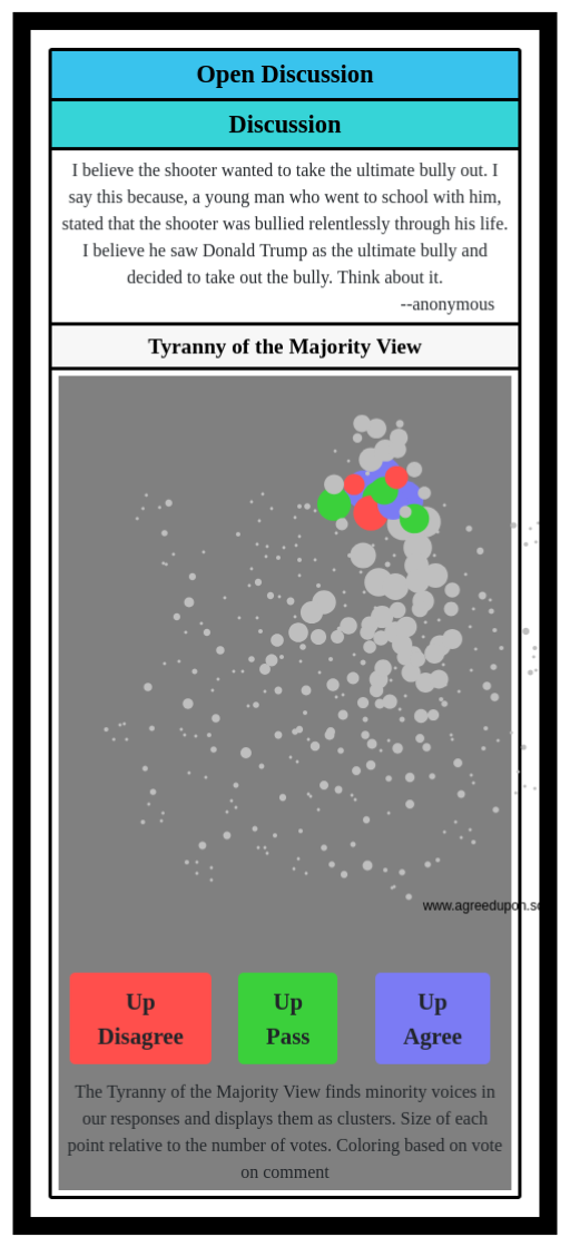The Tyranny of the Majority View finds minority voices in our responses and displays them as clusters. Size of each point relative to the number of votes. Coloring based on vote on comment